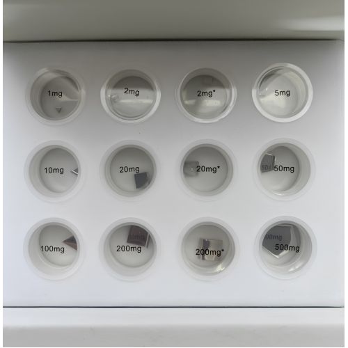 - Диапазон от 1 мг до 500 мг — позволяет выполнять поверочные и контрольные операции с малыми значениями массы без подбора отдельных позиций поштучно.